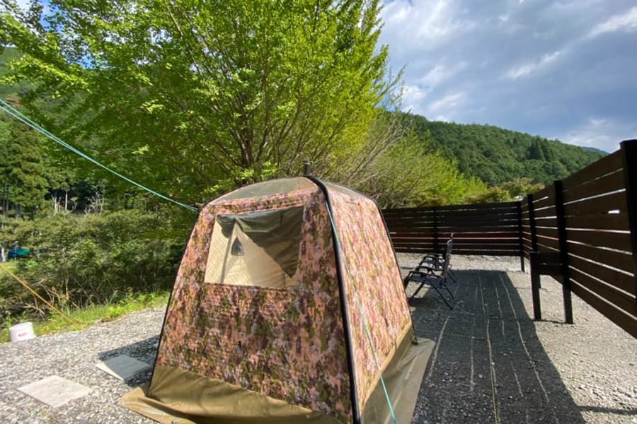 各サイトに、掘りごたつ式の食事スペースをご用意しております。雨・風よけのカーテン付きなので、生憎の天気でも安心してゆっくりと食事をお楽しみいただけます。